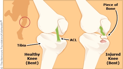 The tibial spine is located at the top front area of the shinbone (tibia) near the knee. In adults, the tibial spine is hardened bone, but in kids who haven't finished growing, it's soft and more prone to injury. Your child had a tibial spine avulsion. This happens when the anterior cruciate ligament (ACL) pulls a small piece of bone away from the top of the shinbone.