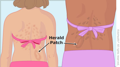 Pityriasis rosea (pit-ih-RYE-uh-sis ROE-zee-uh) is a harmless rash that usually starts on the chest, abdomen, or back as one large patch (the "herald" patch). After a week or two, many smaller scaly oval spots develop and spread equally on both sides of the body. It often forms a pattern that looks like a Christmas tree. Sometimes it spreads to the arms and legs, and it can be mildly itchy.