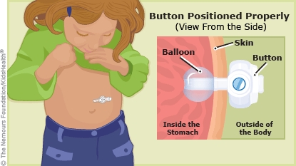 A gastrostomy tube (G-tube) goes through the skin of the belly directly into the stomach. It can be a flat button (as shown below) or a long tube. Even with the right care, a G-tube sometimes can get dislodged (come out of place). If this happens, the hole (stoma) can begin to close. The G-tube needs to be put back in quickly (within 4 hours).