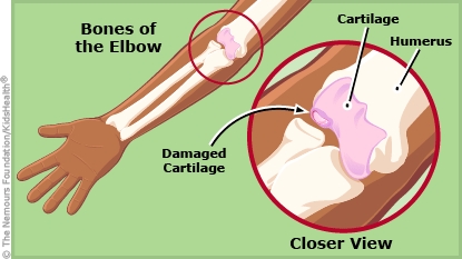 Your child has osteochondritis dissecans (oss-tee-oh-kon-DRITE-iss DISS-ih-kanz) of their elbow. Osteochondritis dissecans is a small area of damaged bone and cartilage (tissue that protects and supports bones) that can become loose or break away from the rest of the bone. Kids who have it usually have pain in the area, especially when they are active. If it's not treated, it can lead to continued pain, swelling, catching or locking of the joint, limited movement of the elbow, and sometimes arthritis (a condition that causes joint pain, swelling, and stiffness).