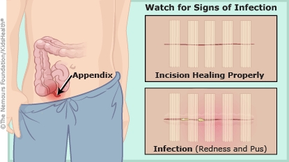 Your child had surgery to remove the appendix (an appendectomy). While your child was asleep, the surgeon made a small cut in the belly, removed the appendix, then closed the cut with dissolvable stitches. Follow these instructions to keep your child comfortable during recovery.