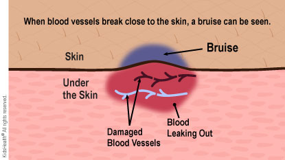 A bruise (also called a contusion) happens when small blood vessels under the skin leak blood after an injury. The trapped blood might show as red or purple marks on the skin or, if the bruise is very deep and involves the muscle, nothing may be visible on the skin. A bruise usually hurts when touched, especially for the first few days after the injury.