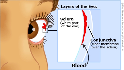A subconjunctival hemorrhage (sub-con-JUNK-tih-vul HEM-er-ij) is a harmless red area on the white of the eye. It happens when tiny blood vessels in the conjunctiva (a clear membrane covering the white part of the eye) leak. It isn't painful, but it can cause a little irritation of the eye. Treatment usually isn't needed.