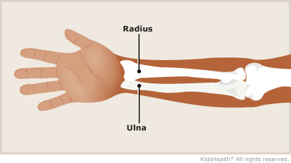 At today's visit, the orthopedic specialist (bone specialist) checked your child's arm and X-rays. Your child has a fracture in the radius bone at the end where it joins the wrist. Your child will wear a cast while the bone heals. Healing time varies, but kids usually need a cast for 4–6 weeks. It's important to take good care of the cast to keep the skin under it healthy and avoid problems.