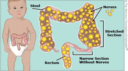 In Hirschsprung disease, a person is born with too few or no nerve cells in part or all of the large intestine (colon). This makes it difficult for stool to pass through the colon and out of the anus. A blockage forms, so the child becomes constipated and cannot poop normally. If this is not corrected, this can sometimes lead to life-threatening complications.