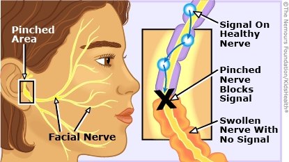 In Bell's palsy, the facial nerve swells because it has become inflamed or injured. The swollen nerve gets pinched where it passes through the skull. Messages don't get through the pinched nerve, so the muscles move weakly or not at all. One side of the face may droop and the eyelid may not close completely.