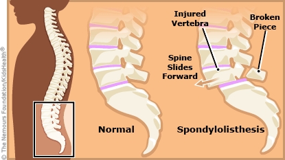 Spondylolisthesis (spon-duh-lo-les-THEE-sis) happens when one of the small bones in the lower back, called a vertebra, slips out of place. It usually starts with a crack or break in the bone caused by too much strain (called a stress fracture) that gets worse. Rest and physical therapy help most kids feel better, but sometimes spondylolisthesis needs surgery.