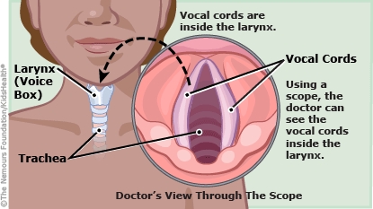 - Flexible laryngoscopy: The health care provider uses a thin flexible tube that can be inserted through the nose or mouth. It has a light and camera on the end, letting the health care provider see the throat through the scope's eyepiece or on a monitor in the room. Usually, it's done in the office or clinic with the child awake, using numbing medicine for the throat. Sometimes it's done while the child is under general anesthesia. The procedure can help a health care provider diagnose problems in the throat and larynx.