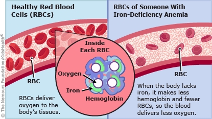 Iron-deficiency anemia is when the body doesn't have enough iron. When this happens, the body can't make enough hemoglobin and red blood cells. Red blood cells are needed to deliver oxygen throughout the body. Iron-deficiency anemia usually goes away with treatment.