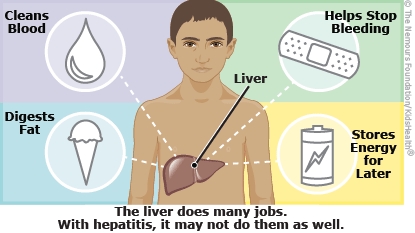 Hepatitis B is when the liver gets infected by the hepatitis B virus and might not work as well as it should. The liver, an organ in the right upper abdomen, has several jobs, including breaking down fatty food, storing energy, clearing toxins from the blood, and making proteins that help blood to clot.