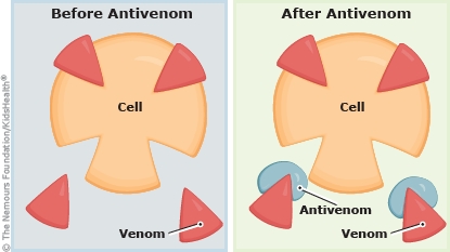 What is antivenom? It's a liquid made from the antibodies (special proteins that are part of the immune system) of animals that have been exposed to small amounts of snake venom. When the antivenom is injected into someone who has been bitten by a venomous snake, the antibodies attach to the venom toxins and prevent them from harming the body.