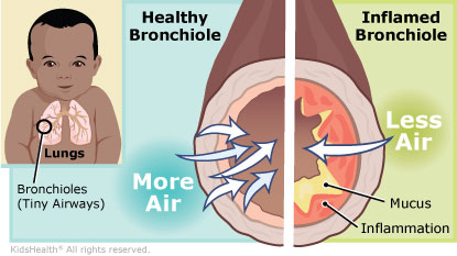 What causes bronchiolitis? Kids get bronchiolitis because a virus — like RSV (respiratory syncytial virus), rhinovirus (the cold virus), or influenza (the flu virus) — gets into their lungs. The viruses can irritate tiny airways called bronchioles. The airways swell and fill with mucus, making kids wheeze.