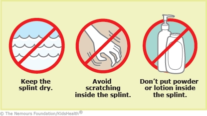 - Keep dirt, sand, lotion, and powder away from the splint.