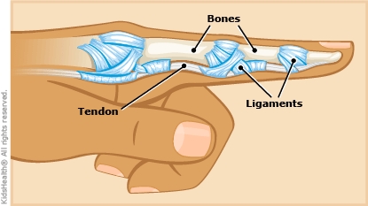 A sprain happens when a ligament in the finger stretches or tears. Ligaments are stretchy bands that connect bones to each other. Finger sprains happen when the finger twists or bends back too far, usually from falling on an outstretched hand or catching a ball.