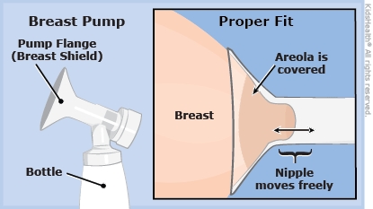 - Place the pump flange (breast shield) over your nipple and areola (dark skin around the nipple). The nipple should be able to move freely inside the tube without rubbing against the sides. A good fit helps you make sure there's a good milk flow and prevents pain and irritation. Talk to your lactation consultant or nurse if you're not sure which size pump flange to use.