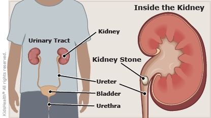 Kidney stones happen when minerals form crystals inside the kidneys. There they get bigger and become kidney stones. Kidney stones can get stuck in the kidney or they can travel out of the kidney into the ureter (the tube that connects the kidney to the bladder). Most stones cause problems like side pain and blood in the urine (pee). Some stones also can block the flow of pee. Pain medicine and plenty of fluids help kids get better without long-term problems.