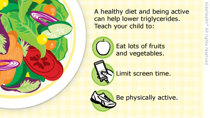 For most kids, eating a healthy diet and being physically active can help lower triglycerides. If your child is overweight, losing weight also will help. Always talk to your health care provider before putting your child on a diet.