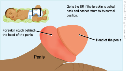 Paraphimosis (par-uh-fye-MOE-sis) is when the foreskin gets stuck behind the head (tip) of the penis. This cuts off blood flow and can damage the penis. The health care provider moved the foreskin back in place. Sometimes that means making a small cut in the foreskin. Here's what to do at home to help your child's penis heal and prevent future problems.