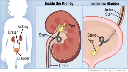 How does the stent come out? If the stent is only going to be in place for a few days to a week, there may be a string attached to the end of it. This string will come out of the urethra (where pee comes out) and be taped to your child's leg. This type of stent is removed either at home or in the office, depending on what you and your urologist decide. Stents that are in place for several weeks or months are removed by the urologist in the operating room.