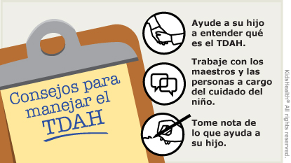 Los niños con trastorno por déficit de atención con hiperactividad (TDAH) pueden tener problemas para prestar atención. También pueden tener dificultad para permanecer sentados, suelen hacer cosas sin pensar y tener problemas de conducta. Sin tratamiento, el TDAH puede provocar baja autoestima, depresión, mal comportamiento, problemas en la escuela, conductas de riesgo o conflictos familiares. Con el apoyo adecuado de la familia y los profesionales del cuidado de la salud, los niños pueden aprender a manejar su TDAH.