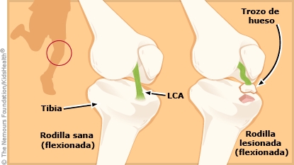 La espina tibial (eminencia intercondilea tibial) se encuentra en la zona frontal superior de la tibia, cerca de la rodilla. En los adultos, la espina tibial es un hueso endurecido, pero en los niños que todavía están creciendo, es blanda y más propensa a sufrir lesiones. Su hijo sufrió una avulsión de la espina tibial. Esto sucede cuando el ligamento cruzado anterior (LCA) rompe un pequeño trozo de hueso de la parte superior de la tibia.
