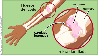 Su hijo tiene osteocondritis disecante en el codo. La osteocondritis disecante es una pequeña zona de hueso y cartílago (tejido que protege y sujeta a los huesos) que presenta una lesión y puede aflojarse o desprenderse del resto del hueso. Los niños que la padecen suelen tener dolor en la zona, en especial cuando están activos. Si no se hace un tratamiento, la osteocondritis disecante puede causar dolor continuo, inflamación, bloqueo articular (articulación trabada), movimiento limitado en el codo y, en algunos casos, artritis (una afección que causa dolor, inflamación y rigidez en las articulaciones) con el paso del tiempo.