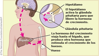 ¿Qué ocurre en la deficiencia de la hormona del crecimiento? Normalmente, el hipotálamo (una parte del cerebro que se encuentra justo arriba de la glándula pituitaria) envía mensajes a la glándula pituitaria provocando que esta libere hormona de crecimiento en la sangre. La hormona del crecimiento luego indica al hígado que libere otra hormona que favorece el crecimiento de los huesos. En la deficiencia de la hormona del crecimiento, la glándula pituitaria no genera ni libera suficiente hormona de crecimiento, por lo tanto, los huesos no se desarrollan de manera normal.
