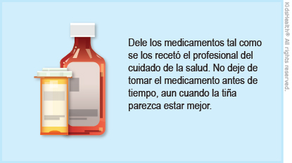 ¿Cómo puedo evitar que vuelva la tiña? Primero, asegúrese de que su hijo tome todo el medicamento exactamente como se le indicó para que la tiña no regrese. La tiña puede ocurrir en la cabeza o el cuerpo. Para prevenir todas las formas de tiña, debe hacer lo siguiente: