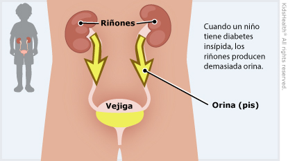 En la diabetes insípida central, el cuerpo produce demasiada orina porque no crea suficiente cantidad de una hormona llamada "hormona antidiurética" (ADH). Los niños con diabetes insípida central tienen mucha sed y beben mucho líquido para reponer los líquidos que pierden al orinar.