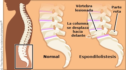 La espondilolistesis ocurre cuando uno de los pequeños huesos de la parte inferior de la columna, llamados "vértebras", se desplaza. Esto suele comenzar con una fisura o rotura del hueso provocada por un exceso de tensión (denominada "fractura por estrés") que empeora. El reposo y la terapia física ayudan a la mayoría de los niños a sentirse mejor; pero, en algunos casos, la espondilolistesis requiere cirugía.
