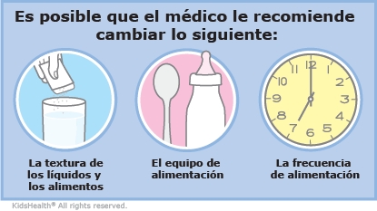 ¿Cómo se trata la disfagia orofaríngea? El tratamiento se basa en los problemas específicos que causa la disfagia orofaríngea. Tal vez incluya un cambio en la textura o la consistencia de los alimentos; comidas pequeñas y más frecuentes; o un cambio en los elementos que se usan para alimentarlo (pezoneras, cucharas o tazas). Es posible que también incluya terapia con un terapeuta del habla o un terapeuta ocupacional. El terapeuta podrá mostrarle ejercicios con la boca para facilitar la alimentación y su hijo los puede practicar en su casa. Los ejercicios pueden mejorar la fuerza y la coordinación de los músculos que se usan para comer.