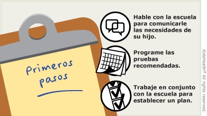 Las escuelas públicas y algunas escuelas privadas ofrecen servicios (como tutorías, más tiempo para completar los exámenes o terapia física u ocupacional) para ayudar a los estudiantes a avanzar en la escuela. Una persona con problemas de aprendizaje u otras necesidades especiales debido a una discapacidad o una afección o enfermedad crónica (a largo plazo) puede beneficiarse con estos servicios. A continuación, verá cómo trabajar con la escuela de su hijo para asegurarse de que reciba el apoyo que necesita.