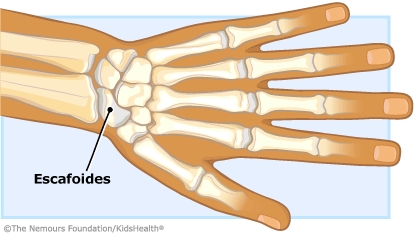 El escafoides, un pequeño hueso de la muñeca, se puede fracturar (quebrar) cuando un persona se cae y apoya la mano para detener la caída o sufre un golpe directo en la mano. El tratamiento para una fractura del escafoides es una escayola o una férula para mantener al hueso en su lugar de manera que se cure. Una escayola es una venda rígida que rodea la mano y la muñeca. Una férula cuenta con soportes que se mantienen en el lugar por medio de correas. A los niños que se les ponga al principio una férula se les colocará una escayola unos días después. El especialista en huesos (ortopedista o traumatólogo) verá a su hijo periódicamente y tal vez le pida pruebas por la imagen (como una radiografía o una resonancia magnética) para asegurarse de que el hueso se esté soldando correctamente.