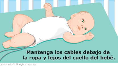 Siga las instrucciones del fabricante para configurar el monitor. Utilice el monitor de apnea cuando su bebé esté dormido o en un lugar donde usted no lo puede ver, y mantenga los cables debajo de la ropa y lejos del cuello de su bebé. Cuando esté con su bebé y ambos estén despiertos, puede quitarle el monitor.