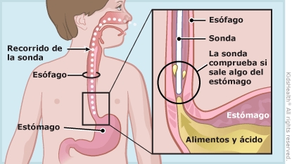 El profesional del cuidado de la salud hizo pasar una sonda (un tubo delgado con sensores) a través de la nariz de su hijo hasta el esófago (el conducto que lleva los alimentos desde la garganta hasta el estómago). Algunos sensores pueden detectar si sale algo del estómago hacia el esófago y con qué frecuencia ocurre. Otros sensores rastrean el nivel de acidez (pH) del líquido del estómago. La sonda generalmente se deja colocada durante 24 horas para tomar mediciones mientras su hijo realiza actividades normales, como comer, beber y dormir.