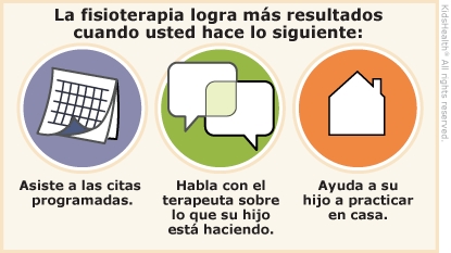 La fisioterapia está a cargo de un fisioterapeuta (un profesional del cuidado de la salud con formación especializada en el movimiento y funcionamiento del cuerpo). Aquí le explicamos cómo ayudar a su hijo a aprovechar al máximo la fisioterapia.